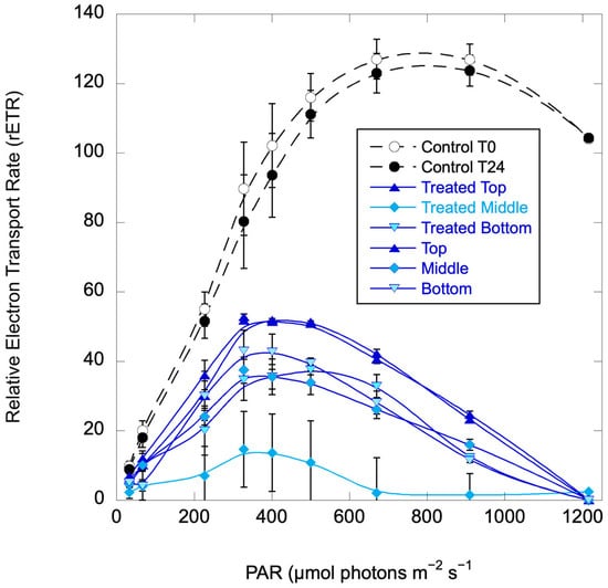 Relative Electron Transport Rate (rETR) curves for the H. akashiwo control (untreated) columns at the initiation of the experiment (T0) and at 24 h, and for replicate treated columns at 24 h. Error bars are standard deviations for replicate columns (control) or three replicates from each of two treated columns.