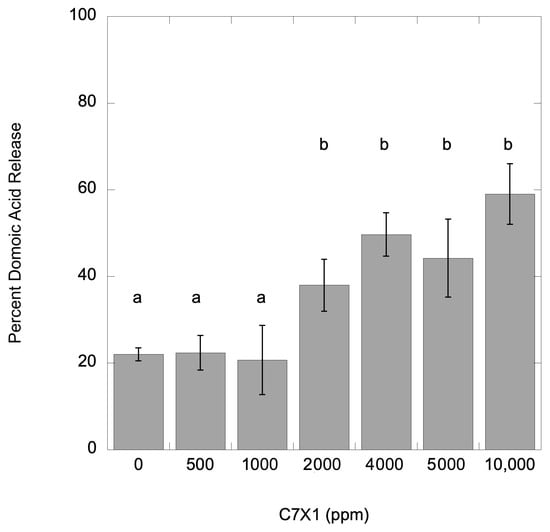 For the M. aeruginosa and P. multiseries cultures, samples from the IC50 experiments were sampled for total and dissolved (released) toxin concentrations for microcystins and domoic acid, respectively. Data for the toxin release experiments are presented as a percent dissolved toxin. The control (no C7X1 treatment) samples had 22.0% (±1.5%) dissolved toxin and 885.0 (±55.2) µg L−1 total toxin. Replicates were analyzed after exposure for 24 h to 500, 1000, 2000, 4000, 5000, and 10,000 ppm C7X1. Results are presented in Figure 8. There was no significant difference from the control up to 1000 ppm C7X1 (p < 0.001) and 58.9% (±6.9%) release at the highest dose of 10,000 ppm. Doses greater than 1000 ppm resulted in significantly more domoic acid release (p > 0.05).