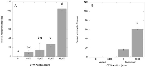 Percent toxin release from M. aeruginosa culture (A) and Pinto Lake water (B) from column experiments in August (left) and September (right). Error bars are the standard deviation from three replicates, letters (panel (A)) and asterisks (panel (B)) indicate significantly different groupings (Tukey HSD, p < 0.05).