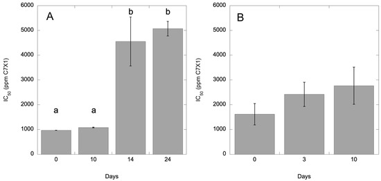 IC50 for (A) I. galbana and (B) H. akashiwo treated with C7X1 that was exposed to natural sunlight in UV-transparent quartz tubes for 0–24 days (A) and 0–10 days (B). Error bars are the standard deviation of three biological replicates. Letters indicate significantly different groupings (Tukey HSD, p < 0.05).