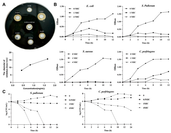 Bacteriostatic effect of ZnO-QDs on E. coli, S. aureus, S. Pullorum, and C. perfringens in vitro. The diameter of the inhibition zone of C. perfringens (A); bacteriostatic effect of 0, 1, and 4 MIC ZnO-QDs (B); time-kill curves of 0, 0.5, 1, and 4 MIC ZnO-QDs (C). Values are means of one to three independent experiments.