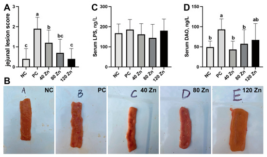 Compared to the NC group, the PC group exhibited ulceration, a thinner intestinal wall of the jejunum, and an increased (p < 0.05) lesion score (Figure 2A,B). Notably, dietary supplementation of ZnO-QDs significantly alleviated the intestinal lesions, with the 120 mg Zn dosage exhibiting the most pronounced ameliorative effect. Although the serum LPS showed no differences among the groups (Figure 2C), further serum DAO analysis showed that the PC group significantly increased (p < 0.05) the DAO contents when compared to the NC group, while the 40 and 80 mg Zn groups significantly mitigated (p < 0.05) this elevation (Figure 2D).