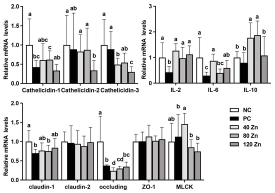 Effect of ZnO-QDs on antimicrobial peptide, cytokine, and tight junction gene relative mRNA levels in the jejunum of broilers infected by C. perfringens. Values are means ± SD, n = 7–10. Different letters between groups represent significant differences, p < 0.05. IL, interleukin; ZO-1, tight junction protein 1; MLCK, myosin light chain kinase; NC, negative control without treatment; PC, positive control with oral gavage of C. perfringens; 40 Zn, 80 Zn, and 120 Zn, dietary supplementation with 40, 80, and 120 mg/kg ZnO-QDs with oral gavage of C. perfringens.