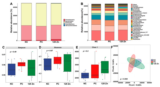 Relative abundance of the 5 phyla (A) and top 25 genera (B); alpha diversities, including Simpson index, Shannon index, and Chao 1 index (C–E); and principal coordinates analysis (PCoA) plots (F) in the three groups. n = 7–8. NC, negative control without treatment; PC, positive control with oral gavage of C. perfringens; 120 Zn, dietary supplemented with 120 mg/kg ZnO-QDs with oral gavage of C. perfringens.