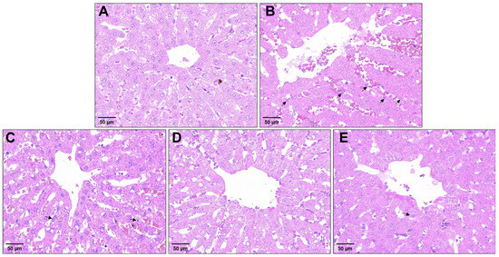 Effects of SeMet on liver tissue structure in rabbits exposed to ZEA. Representative graphs of liver sections stained with HE (20× magnification; scale bar = 50 μm): Black arrows, inflammatory cell infiltration (n = 5). Treatments represented as (A) control, (B) ZEA-challenged group, (C) SeMet-L group, (D) SeMet-M group and (E) SeMet-H group. Control group exhibited orderly arranged hepatocytes and hepatic sinusoids around central vein and intact structural integrity. ZEA-challenged group displayed disorganized hepatocyte alignment, dilated and congested sinusoids and inflammatory infiltration. Groups pretreated with different doses of SeMet showed notably ameliorated histoarchitectural damage, with most pronounced improvement (p < 0.05) in medium-dose group.
