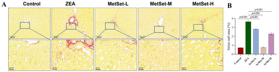 The abnormal deposition of collagen fibers, which is regarded as a hallmark of inflammation, was evaluated through Sirius red staining. As depicted in Figure 2A, the hepatic architecture in the control group remained well preserved, with only minimal collagen fiber deposition observed around the vascular and central vein regions. In contrast, the ZEA-challenged group displayed an elevated accumulation of collagen (Figure 2B), indicative of heightened hepatic inflammation, which was further corroborated by a quantitative analysis of the collagen volume fraction (p < 0.001). On the other hand, pretreatment with different doses of SeMet led to varying degrees of fibrosis alleviation, reducing it by 22.7%, 78.8% and 37.4%, respectively (Figure 2B, p < 0.001). Notably, the medium-dose SeMet group exhibited a markedly reduced collagen distribution, with pathological scoring showing a significantly lower fibrotic area compared to the ZEA group (p < 0.001). Although the low- and high-dose groups exhibited a partial reduction in collagen deposition, their alleviating effect, as quantified by fibrosis scoring, was inferior to that of the medium-dose group.