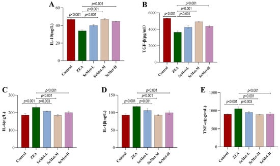 It is well-known that inflammatory cytokines exhibit dynamic expression patterns during various types of inflammatory injuries. In this study, hepatic concentrations of anti-inflammatory cytokines (IL-10 and TGF-β) and pro-inflammatory mediators (IL-6, IL-1β and TNF-α) were quantified via ELISA in rabbits across experimental groups. As demonstrated in Figure 3, relative to controls, ZEA exposure significantly suppressed anti-inflammatory cytokine levels, with IL-10 and TGF-β reduced by 27.5% and 31.6%, respectively (p < 0.001), Conversely, it markedly upregulated pro-inflammatory cytokines, evidenced by 24.1%, 30.0% and 16.9% elevations in IL-6, IL-1β and TNF-α levels (p < 0.001), suggesting that ZEA can induce a hepatic inflammatory response. Notably, the differential restoration of inflammatory cytokine levels was achieved after supplementation with different doses of SeMet, with the medium-dose group exhibiting the more pronounced regulatory effect. Specifically, in the SeMet-M group, the levels of IL-10 and TGF-β were restored by 38.2% and 34.8%, respectively, while the levels of pro-inflammatory cytokines IL-6, IL-1β and TNFα were restored to a baseline range similar to that of the control group (with respective decreases of 20.2%, 20.8% and 15.6%) (p < 0.001). Despite improvements in the cytokine profiles (IL-10, IL-6, IL-1β) observed in the high-dose group, high-dose SeMet exhibited an attenuated regulatory potency compared to the medium-dose SeMet. These results indicated that SeMet could alleviate ZEA-triggered hepatic inflammation by the bidirectional modulation of inflammatory cytokines.