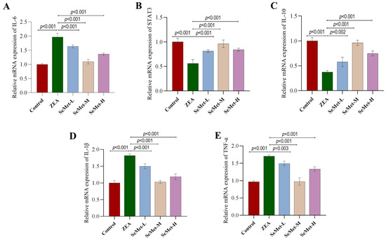 To elucidate the mechanism of the SeMet-mediated mitigation of hepatic inflammatory injury induced by ZEA, qPCR analysis was employed to quantify transcriptional profiles of IL-6/STAT3 pathway-related genes in rabbit livers. As shown in Figure 4, compared with the control group, the mRNA level of IL-6 (an upstream component of the pathway) in the livers of rabbits exposed to ZEA significantly increased by 96.7% (p < 0.001), while the mRNA level of its downstream effector STAT3 significantly decreased by 76.8% (p < 0.05). Meanwhile, the mRNA level of the anti-inflammatory factor IL-10 regulated by STAT3 also significantly decreased by 62.8%, whereas the mRNA levels of the pro-inflammatory factors IL-1β and TNFα showed the opposite trend, significantly increasing by 81.7% and 12.5%, respectively (p < 0.001). After pretreatment with SeMet, the transcriptional levels of these factors were reversed to varying degrees, with the medium dose of SeMet showing a more significant regulatory effect. Specifically, compared to the ZEA group, the mRNA level of IL-6 significantly decreased by 16.9%, 44.4% and 30.6%, respectively (p < 0.001), with the medium-dose group showing the most significant reduction. The mRNA levels of STAT3 and its downstream target IL-10 significantly recovered, respectively (p < 0.05), while the transcriptional levels of IL-1β and TNF-α were reduced to levels comparable to those of the control group (p < 0.05). In comparison, the effects of low-dose and high-dose SeMet were less pronounced than those of the medium dose.