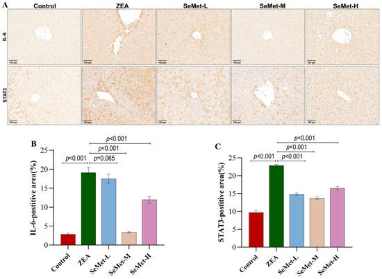 This present study further examined the expression and localization of key proteins in the IL-6/STAT3 pathway using immunohistochemical (IHC) methods. As illustrated in Figure 5, the control specimens exhibited negligible immunoreactivity for IL-6 and STAT3, appearing as faint yellow-brown signals. In contrast, ZEA-exposed livers displayed intense granular immunostaining for both proteins, with deep-yellow signals concentrated in the cells around the portal area and central vein region. Quantitative IHC assessment confirmed the significantly elevated expression of both proteins in the ZEA group compared to the control group (p < 0.001). After pretreatment with SeMet, the immunostaining intensities for both proteins showed varying degrees of reduction. Specifically, medium-dose SeMet displayed a more pronounced effect, with a marked reduction in staining (p < 0.001), which approached but did not fully restore the control levels, which demonstrated that a certain concentration of SeMet could counteract the dysregulation of IL-6/STAT3 pathway-related proteins caused by ZEA.