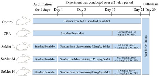 Healthy ninety-day-old Hyla rabbits (3.5 ± 0.1 kg) obtained from the Experimental Animal Center of Henan University of Science and Technology (Luoyang, China) underwent seven-day acclimatization under controlled conditions (21–25 °C, 50–70% relative humidity). Following acclimation, animals were randomly allocated into five groups (ten per group, with an equal number of male and female rabbits): control, ZEA, low-dose SeMet (SeMet-L), medium-dose SeMet (SeMet-M) and high-dose SeMet (SeMet-H). Throughout the trial, each rabbit was provided with 200 g of a basal diet daily (compositions are detailed in Table S1) along with ad libitum water access. Throughout the three-week experimental phase, SeMet was administrated at concentrations of 0.2, 0.35 and 0.5 mg/kg basal diets to the respective treatment groups [33]. Beginning in the third experimental week, the ZEA and three SeMet groups were administered with 0.5 mL olive oil containing 1.2 mg/kg B.W. ZEA via oral gavage daily for one week [34], whereas the control group was administered equivalent volumes of olive oil (Figure 6). All animal care and experimental procedures strictly adhered to institutional guidelines and national regulations, with formal approval from the Institutional Animal Care and Use Committee (IACUC) of Henan University of Science and Technology (China) (Approval No. 20190619024).
