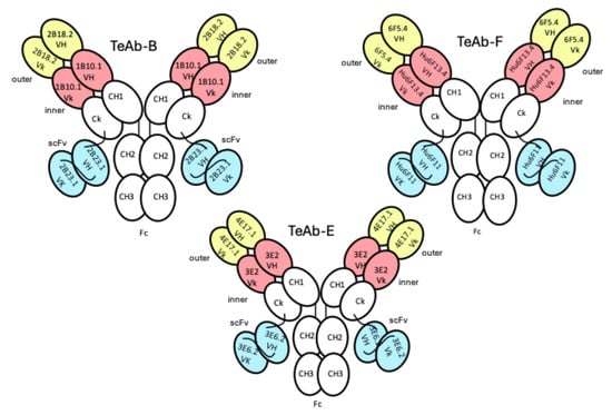 Cartoon of TeAb-B, TeAb-E, and TeAb-F constructs containing three variable domains numbered VH1 and Vk1 (inner, coral), VH2 and Vk2 (outer, yellow), and VH3 and Vk3 (scFv, blue). For BoNT serotype B, variable domain 1 (inner, coral) = mAb 1B10.1, variable domain 2 (outer, yellow) = mAb 2B18.2, and variable domain 3 (scFv, blue) = mAb 2B23.1 [36]. For BoNT serotype E, variable domain 1 (inner, coral) = mAb 3E2, variable domain 2 (outer, yellow) = mAb 4E17.1, and variable domain 3 (scFv, blue) = mAb 3E6.2 [16]. For BoNT serotype F, variable domain 1 (inner, coral) = mAb hu6F13.4, variable domain 2 (outer, yellow) = mAb 6F5.4, and variable domain 3 (scFv, blue) = mAb hu6F11 [35].