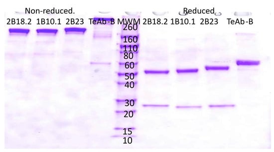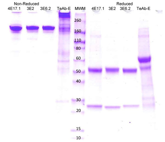 TeAb-F was produced in HEK293 cells with a purity of approximately 80–90% as determined using SDS PAGE, shown in Figure 4. The HEK293 expressed TeAb-F was used for the MNA studies.