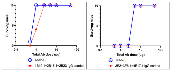 We then tested the potency of TeAb-B and TeAb-E in the MNA, using up to 40,000 mouse LD50. As shown in Figure 5, TeAb-B and TeAb-E were equipotent when compared with the combination of their three parental IgG. One µg of TeAb or IgG combination/mouse protected mice against 40,000 mouse LD50 of BoNT/B1, and 6.25 µg/mouse protected mice against 40,000 mouse LD50 of BoNT/E3.