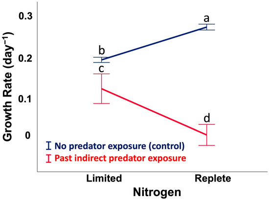 A reaction norm shows the effects of past grazer exposure and nitrogen availability on cell growth rate. N-limited (3 µM L−1) indicates 0.2 µm FSW and N-replete (880 µM L−1) is f/2 medium. Letters indicate significant differences among treatment means (p < 0.05; ANOVA, Post-hoc SNK). Error bars represent ± 1 SD of the mean. The lines are the regression slopes.