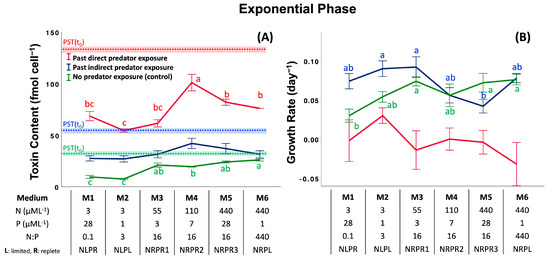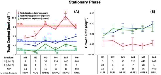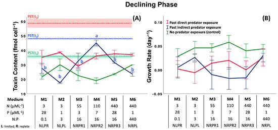 Effects of previous grazer exposure and nutrient media on cell toxin content (A) and cell growth rate (B) in the declining phase (DP). The table shows the nutrient concentrations (nitrate and phosphate) and nutrient ratios of media used in the assay. Dotted lines with shaded areas indicate the initial CTC ± 1 standard deviation of treatments and controls at the beginning of exposure time (t = 0). Letters represent significant differences among treatment means (p < 0.05; ANOVA, Post-hoc SNK). Error bars represent ± 1 SD of the mean.