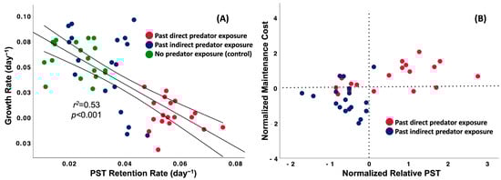 A tradeoff between PST retention rate and cell growth rate (A). The lines represent the best fit regression of PST retention rate versus growth rate with 95% confidence intervals. Relationship between the normalized relative PST (PSTtreatment − PSTcontrol) and the maintenance cost of past grazer-induced PST (CGRcontrol − CGRtreatment) as a function of predation type (B).