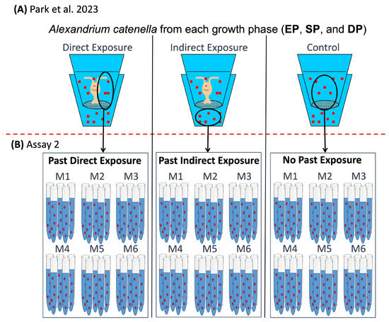 Schematic diagram of experimental design. (A) Grazer-induced toxin production by Park et al. [15] in which Alexandrium catenella cells were exposed directly to grazers or indirectly to grazer cues. Control cells were not exposed to grazers or cues. The exposure duration was 72 h throughout a simulated bloom (EP, exponential phase; SP, stationary phase; and DP, declining phase). (B) An experimental design of assay 2 to test the effects of past grazer exposure and nutrient regime (M1 to M6) on cell toxin content and cell growth rate over 15 days. A red dashed line separates assay 2 from the induction set up designed by Park et al. [15].