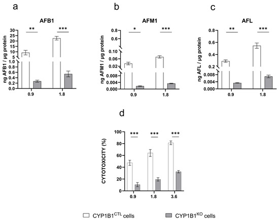 AFB1 metabolite pattern profile and cytotoxicity. Amount of (a) AFB1, (b) AFM1, and (c) AFL quantified by LC-MS/MS in the culture medium of CYP1B1CTL and CYP1B1KO cells treated with AFB1 0.9 and 1.8 µM. Data are expressed as ng of analyte per µg of total protein, as the mean ± mean standard error (SEM) of three biological replicates. (d) Cytotoxicity (WST-1 reagent assay) of increasing AFB1 concentrations in CYP1B1KO and CYP1B1CTL cells. Data are expressed as the mean percentage of dead cells relative to that of cells exposed to the vehicle only (0.1% DMSO) ± SEM of three biological replicates, each performed in sextuplicate. Statistical analysis: one-way ANOVA followed by Dunnett’s multiple comparisons test; *: p < 0.05, **: p < 0.01 and ***: p < 0.001.