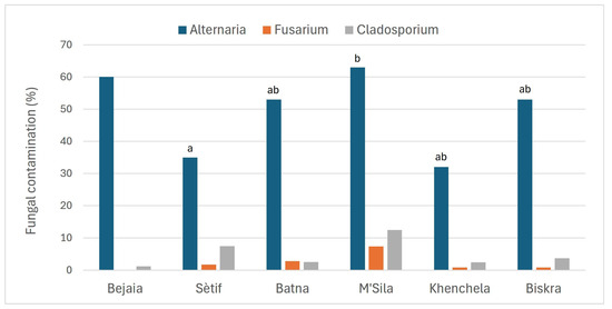 Fungal contamination by Alternaria, Fusarium and Cladosporium genera, expressed as a percentage, detected on wheat kernels collected in six different southeastern regions of Algeria. Alternaria contamination mean values with a different letter, compared using the Kruskal–Wallis test with SPSS Statistics software (v. 29.0.1.0), indicate significant differences between regions at the 0.05 level of significance.