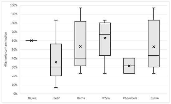 Contamination by Alternaria species, expressed as a percentage, detected on wheat kernels collected in six southeastern regions of Algeria. In each box plot, the limits of the whiskers show minimum and maximum values, X represents the mean value and the line inside the boxes represents the median value.