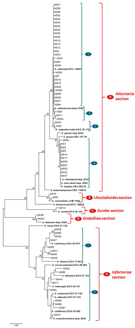 The resulting phylogenetic tree enabled the identification of five distinct clades, named from A to E in Figure 4, based on reference strains. These clades were supported by high bootstrap values (>85%). Moreover, each clade was clearly separated and corresponded to taxonomic sections, including Alternaria, Ulocladioides, Eureka, Embellisia and Infectoriae sections (Figure 4).