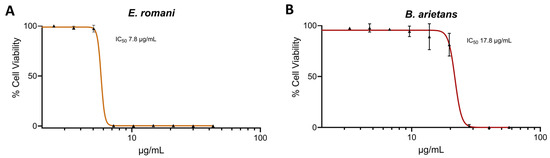 We first investigated the cytotoxic potential of E. romani and B. arietans venoms in a previously described cell cytotoxicity assay using immortalised human epidermal keratinocytes (HaCaT cell line) [41,42]. The HaCaT cells were exposed to crude venoms at various concentrations for 24 h, followed by the addition of thiazole blue tetrazolium (MTT) assaying to assess cell viability via measures of metabolic activity [43,44]. Both venoms were potently cytotoxic in vitro, with no significant differences seen in the IC50 values between E. romani venom and B. arietans (IC50 7.8 μg/mL ± 2.7 vs. IC50 17.8 μg/mL ± 6.2, respectively) (Figure 1).