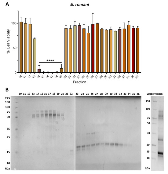 Cytotoxic venom fractions from E. romani correlate with the presence of PIII SVMP toxins. (A) Cell viability was measured in immortalised human keratinocytes (HaCaT cells) using MTT assays. HaCaT cells were treated with fractions of Nigerian E. romani venom, and (B) visualised using reducing SDS-PAGE gel electrophoresis on two separate gels. Crude E. romani venom (ER) was also visualised for comparative purposes (B). In panel (A), the data shown represent mean % cell viability and corresponding standard deviations. All data displayed are from three independent experiments, with each condition conducted in triplicate. The data were plotted using GraphPad Prism 9. Statistically significant differences were determined by one-way ANOVA, followed by a Dunnett’s multiple comparisons test, and are denoted by asterisks: **** (p < 0.0001).
