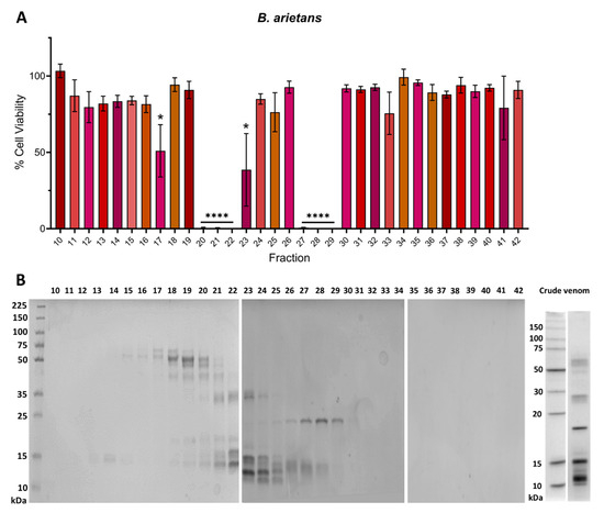We used the same approach to identify which B. arietans SEC fractions caused cytotoxicity in the MTT assays. As with E. romani, multiple SEC fractions were responsible for causing cytotoxicity, with significant reductions in cell viability observed in two main clusters. Cell viabilities were reduced to 0.0% (±0.9) and 0.1% (±1.0) (p ≤ 0.0001) for fractions 20–22 and to between 0.0% (±1.1) and 0.6% (±0.4) (p ≤ 0.0001) for fractions 27–29 (Figure 3A). When aligned to SDS-PAGE analysis of the fractions, we found protein bands that corresponded with the molecular mass of the recently reported [45] 34 kDa PI SVMP from Nigerian B. arietans venom (see fractions 20–23) and the 21 kDa PI SVMP from Tanzanian B. arietans venom (see fractions 27–29) (Figure 3B). Additionally, there were multiple bands with masses of ~15–20 kDa in fractions 23–32. We speculate that these may include PLA2, disintegrins, or CLP monomers [21], which could potentially contribute to the observed cytotoxicity in fractions 27–29 (Figure 3B). Although there was no cytotoxic activity associated with fractions 18 and 19, which contains serine protease bands at 50–55 kDa [46], we did observe a modest, though still significant, reduction in cell viability in fraction 17 (51.0% ± 29.7; p = 0.022), which we hypothesise may contain LAAO, due to this fraction having a band at ~60 kDa (Figure 3A,B).
