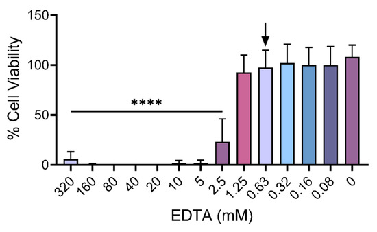 Establishing an appropriate concentration of EDTA to use in cell viability experiments. Cell viability was measured in immortalised human keratinocytes (HaCaT cells) using MTT assays. HaCaT cells were treated for 24 h with serial dilutions of EDTA. The maximal concentration select for use as treatment in subsequent inhibition assays was determined to be 0.625 mM EDTA (black arrow; concentrations displayed in axis are rounded to 2 dp). The data shown represent mean % cell viability and corresponding standard deviations. All data displayed are from three independent experiments, with each condition conducted in triplicate. The data were plotted using GraphPad Prism 9. Statistically significant differences were determined by one-way ANOVA, followed by a Dunnett’s multiple comparisons test, and are denoted by asterisks: **** (p < 0.0001).