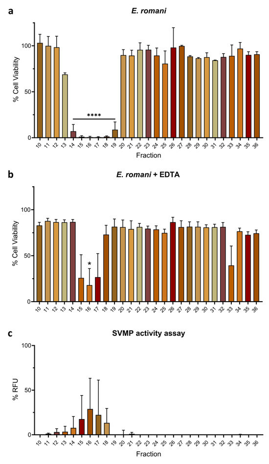 Next, we repeated the earlier MTT assays in the presence of 0.625 mM EDTA to confirm whether cytotoxic activity in the fractions of both venoms was predominately caused by SVMP toxins. Cytotoxicity caused by E. romani venom fractions was reduced from six active fractions (fractions 14–19) causing significant reductions in cell viability (p ≤ 0.0001) to only one fraction (fraction 16; 18.0% ± 31.1; p = 0.040) in the presence of EDTA, with some modest, yet non-significant, cytotoxicity remaining in the adjacent fractions (fractions 15 and 17) (Figure 5a,b). Fraction 16 contained the highest combined content of the ~50–80 kDa proteins, and therefore, remaining activity may have simply been the result of insufficient EDTA to inhibit complete activity of this fraction (Figure 5b). To further explore this relationship between SVMP toxins and venom cytotoxicity, we performed an in vitro fluorescent-based substrate cleavage SVMP enzymatic activity assay [6,51] with the venom fractions. SVMP activity was mostly detected in fractions 15–18 (13.3–28.9% RFU ± 16.2–39.0), with trace activity observed in fractions 11–14 (1.2–7.8% RFU ± 0.6–12.7) (Figure 5c), although variability was high in some fractions. Collectively, these findings demonstrate that cytotoxic fractions from E. romani venom contain SVMP toxins and that the cytotoxic activity of these fractions can mostly be inhibited by the SVMP-inhibiting metal chelator EDTA.