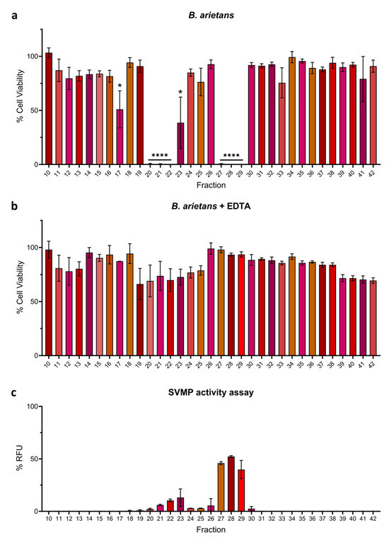 Cytotoxic fractions from B. arietans venom mostly exhibit SVMP activity and can be inhibited by the SVMP-inhibiting metal chelator EDTA. Cell viability was measured in immortalised human keratinocytes (HaCaT cells) using MTT assays. HaCaT cells were treated with fractions of (a) B. arietans venom, and (b) B. arietans venom in the presence of 0.625 mM EDTA. (c) A fluorescent-based enzymatic SVMP activity assay showed that venom SVMP activity was observed in most of the fractions that were active in the MTT assays. In panels (a,b), the data shown represent mean % cell viability and corresponding standard deviations. The data displayed are from three independent experiments, with each condition conducted in triplicate. In panel (c), the data shown represent mean % RFU (intensity measured in relative fluorescence units), relative to crude venom, and corresponding standard deviations. The data displayed are from two independent experiments with each condition conducted in duplicate. The data were plotted using GraphPad Prism 9. In panel (a), statistically significant differences were determined by one-way ANOVA, followed by a Dunnett’s multiple comparisons test, and are denoted by asterisks: **** (p < 0.0001), * (p < 0.05).