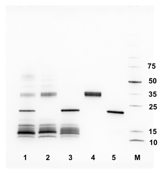 The protein components of the venoms used in this study were separated using size exclusion chromatography (SEC). For this, 5 mg of venom (Echis romani or Bitis arietans) was dissolved in 0.5 mL ice-cold PBS (25 mM sodium phosphate, pH 7.2, 0.15 M NaCl) and centrifuged at 10,000× g for 10 min. The supernatant was immediately loaded onto a 24 mL column of Superdex 200HR (Cytiva) equilibrated in PBS. The column was operated at a flow rate of 0.2 mL/min during loading and 0.5 mL/min for elution. Fractions of 0.5 mL were collected after the void volume, and elution was monitored at 214 and 280 nm. SDS-PAGE analysis was carried out on all fractions seen to contain protein on the trace. The fractions were stored at −20 °C until use. For work involving purified toxins, Nigerian and Tanzanian PI SVMPs were isolated and identified as described by Wilkinson et al. [45].