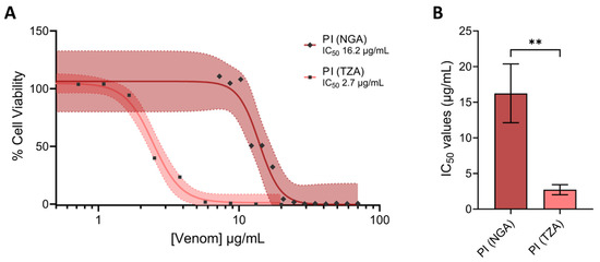 PI SVMPs from puff adder venom exhibited differences in cytotoxic potency. Cell viability was measured in immortalised human keratinocytes (HaCaT cells) using MTT assays. HaCaT cells were treated for 24 h with serial dilutions of PI SVMPs from Nigerian (NGA) and Tanzanian (TZA) B. arietans venoms, displayed here as (A) 95% confidence bands and (B) a summary of the IC50 values of the venoms displayed in (A). The data shown represent mean % cell viability and corresponding standard deviations. All data displayed are from three independent experiments with each condition conducted in triplicate. In panel (A), data were normalised to 0–100% between the lowest and highest read values for analysis, then plotted as 95% confidence band curves using GraphPad Prism 9. In panel (B), the data shown represent the mean IC50 values of the curves in (A) and the corresponding standard deviations. In panel (B), statistically significant differences were determined by unpaired t-tests and are denoted by asterisks: ** (p < 0.01).