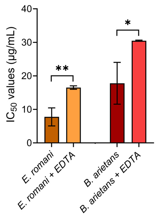 As final confirmation that SVMPs are the primary cytotoxic components in vitro, the earlier MTT assays using whole crude venoms sourced from E. romani and B. arietans were repeated, but this time in the presence of EDTA. HaCaT cells were exposed to serial dilutions of crude venom in the presence of 0.625 mM EDTA, before the cell viabilities were measured as described previously. Cytotoxicity was significantly reduced for both the E. romani (IC50 7.8 μg/mL ± 2.7 vs. IC50 16.5 μg/mL ± 0.5; p = 0.005) and B. arietans (IC50 17.8 μg/mL ± 6.2 vs. IC50 30.5 μg/mL ± 0.2; p = 0.024) venoms when incubated with the metalloproteinase-inhibiting metal chelator EDTA (Figure 9).