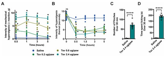 2.1. Tityus serrulatus Venom Induces Dose-Dependent Mechanical and Thermal Hyperalgesia, Spontaneous Pain Behaviors, and Local Inflammatory Responses