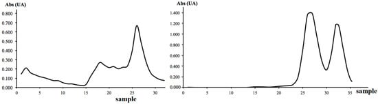 As shown in Figure 1 (left), affinity chromatography was not sufficient to obtain pure ebulin-f from the fresh extract. Nevertheless, with this first isolation, lectins with affinity for galactose were obtained. Aliquots 15–30 were pooled and concentrated in an Amicon® before their elution through a size-exclusion chromatography column. The obtained chromatogram (Figure 1—right) shows two defined peaks but is not completely resolved. To avoid impurities from SELfd, ebulin-f was isolated from aliquots 33 and 34.