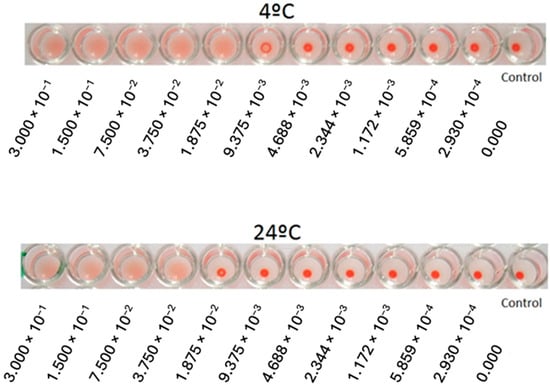Characterization of the activity of ebulin-f was performed by hemagglutination of red blood cells from human blood type O, Rh +, at 24 °C and 4 °C. Ebulin-f was able to agglutinate it at 24 °C with a minimum protein concentration of 37.5 µg/mL and at 4 °C with a minimum concentration of 18.8 µg/mL (Figure 2). These results are in accordance with previous results from our research group.
