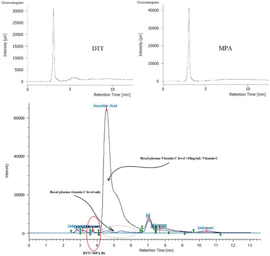 Vitamin C-DTT chromatogram (top-left), vitamin C-MPA chromatogram (top-right), and vitamin C-undoped plasma chromatogram overlaid with a vitamin C-doped plasma chromatogram (bottom).
