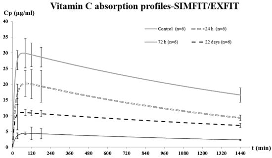 The main pharmacokinetic parameters were estimated from the vitamin C plasma concentration vs. time plots previously fitted to a two-compartment model generated with the SIMFIT-EXFIT package (Table 2).