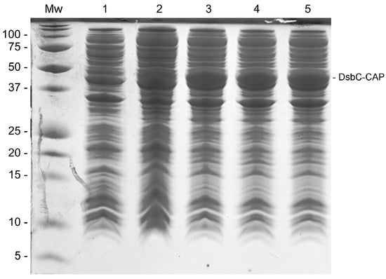 The SDS-PAGE gel displaying different production conditions of DsbC-CAP in E. coli. Lane Mw: Protein molecular weight standard. Lane 1: Clarified lysate of non-induced cells incubated at 37 °C and 250 rpm for 3 h. Lanes 2–5: Cells were initially incubated at 37 °C and 250 rpm for 3 h. Lane 2: Clarified lysate of induced cells grown further at 28 °C for 6 h. Lane 3: Clarified lysate of induced cells grown further at 28 °C overnight. Lane 4: Clarified lysate of induced cells grown further at 25 °C for 24 h. Lane 5: Clarified lysate of induced cells grown further at 28 °C for 24 h.