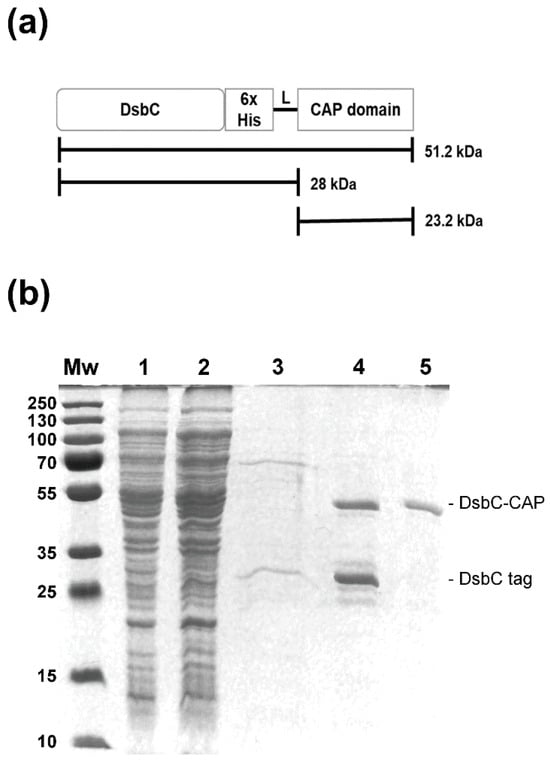 Recombinant protein purification by nickel–nitrilotriacetic acid affinity chromatography (Ni-NTA). (a) Full scheme of the recombinant protein, including the DsbC, Sc-CAP domain, and polyhistidine tag. (b) SDS-PAGE gel demonstrating the production of the DsbC-CAP recombinant protein in E. coli RII (DE3) and the various steps of the purification protocol. Lane Mw: Protein molecular weight standard. Lane 1: Soluble lysate following the sonication and centrifugation of induced cells containing the expression vector. Lane 2: Ni-NTA column flowthrough. Lane 3: Ni-NTA column wash with 50 mM imidazole. Lane 4: Eluate from the Ni-NTA agarose column of recombinant protein. Lane 5: Protein dialysis against PBS using a centrifugal membrane filter with a 50 kDa cutoff.