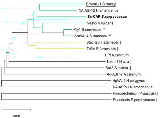 The Sc-CAP protein was localised in the same branch as the BmVal-1 and Na-ASP-2 proteins, in accordance with the observed superposition of the structures. Another close branch is composed of Ves v5 from Vespula vulgaris, Pry1 from Saccharomyces cerevisiae, and SmVAL4 from Schistosoma mansoni. The other branches are primarily composed of proteins from the phylum Chordata, along with a few structures belonging to nematodes.