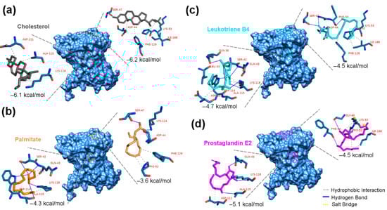 Regarding the docking results of both eicosanoids, they interacted with slightly better affinity towards the PBC, forming more molecular hydrophobic and hydrogen bonds. The leukotriene B4 interacted with the CBM, exhibiting a binding energy of −4.5 kcal/mol, while displaying an energy binding of −4.7 kcal/mol with the PBC (Figure 5c). It formed two hydrogen bonds with an additional Phe-50 amino acid, unlike cholesterol in the same CBM binding pocket, and presented more interactions than palmitate in the alternative pocket, forming hydrogen and hydrophobic bonds with three additional amino acids (Gln-36, Leu-33, and Asp-111).