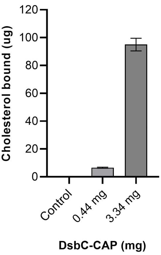 The sterol-binding capacity of the CAP protein was assessed in vitro by incubation of 80 µg/mL cholesterol with different amounts of the DsbC-CAP recombinant protein in binding buffer (20 mM Tris-HCl, pH 7.5, 30 mM NaCl, and 0.05% Triton X-100) for 1 h at 30 °C. The protein was then separated from the unbound cholesterol using nickel magnetic agarose beads (His Mag Sepharose™ Ni, Merck, Lisbon, Portugal), the liquid above was discarded, and the magnetised beads were rinsed with binding solution. Beads were resuspended in elution buffer (20 mM Tris-HCl, pH 7.5, 500 mM imidazole, 30 mM NaCl, and 0.05% Triton X-100) for 1 min under agitation. After the magnetisation of the beads, the supernatant was collected for the measurement of sterol by cholesterol quantification assay kit CS0005 (Sigma-Aldrich, Lisbon, Portugal). The same procedure was applied to the DsbC tag only in PBS to serve as a negative control. The binding capacity is expressed as the total final amount of cholesterol co-purified with recombinant protein. Three independent assays were conducted under the above experimental conditions, and the data were reported as mean ± S.D.