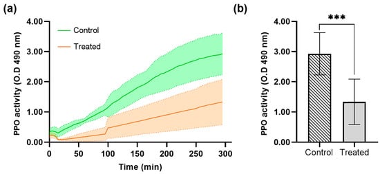 Prophenoloxidase activity (PPO) and optical density (OD) average at 490 nm in the Galleria mellonella larvae hemolymph treated with recombinant protein DsbC-CAP. (a) Phenoloxidase activity kinetics over 300 min for the control (n = 12) and treated (n = 12) groups. (b) Maximum phenoloxidase activity was achieved in the control and treated groups. Data are presented as mean ± S.D. The asterisks (***) show a significant difference (p < 0.001) between the control and treated groups (unpaired t-test).