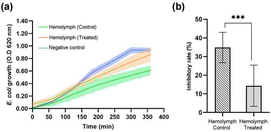 Escherichia coli bacterial growth and optical density (OD) average at 620 nm in the Galleria mellonella larvae hemolymph treated with recombinant protein (DsbC-CAP) and treated with DsbC tag in PBS (hemolymph control). The negative control group consisted of bacterial growth in LB medium only. (a) Bacterial growth curves over 350 min for the control (n = 11), treated (n = 10), and negative control groups (n = 10). (b) The maximum inhibition rate of bacterial growth achieved by the hemolymph-treated and control groups. The inhibition rates were calculated based on the equation described by Guo et al. (2025) [27]. Data are presented as mean ± S.D. The asterisks (***) show a significant difference (p < 0.001) between the control and treated groups (unpaired t-test).