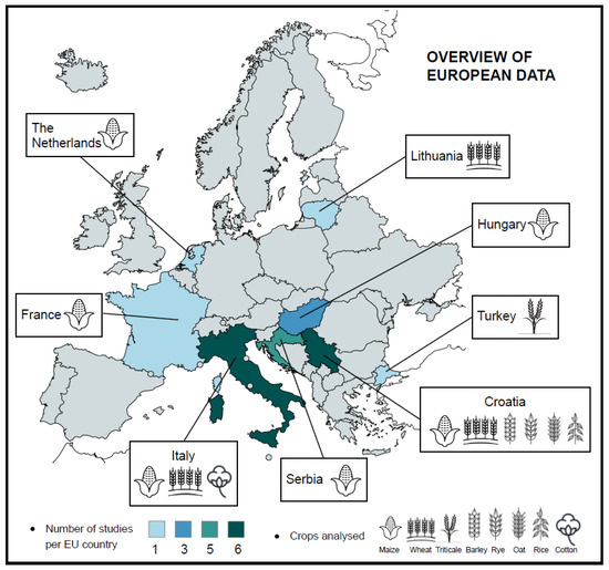 Maize dominates AF contamination research in Europe, reflecting its widespread cultivation and critical role in FFS. Studies were conducted in The Netherlands [50], Italy [29,51,61,64], Hungary [52,65,67], Serbia [53,56,57,60,63,68], Croatia [28,55,62,66,68], and France [58].