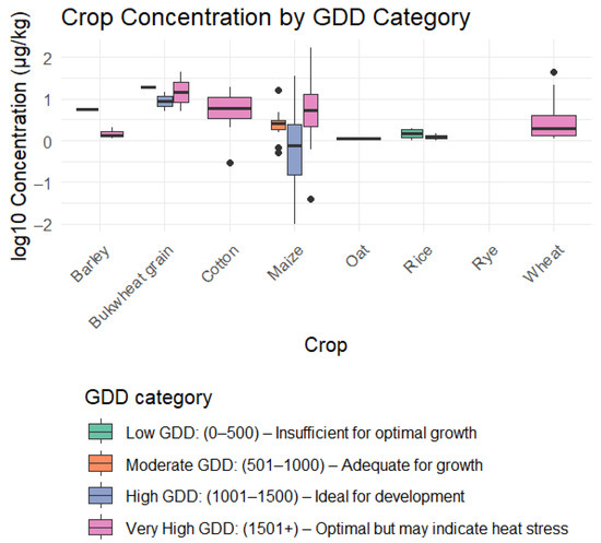 Most studies were conducted during periods characterized by high and very high GDDs, which generally represent optimal conditions for crop development but may signal increased risk of heat stress (Figure 3). Under these thermal conditions, average Afs concentrations, ranging from 10 µg/kg up to 165 µg/kg, were most frequently reported, highlighting this as a critical period for AF development. This pattern was particularly evident in maize, which accounted for the majority of reported outliers.