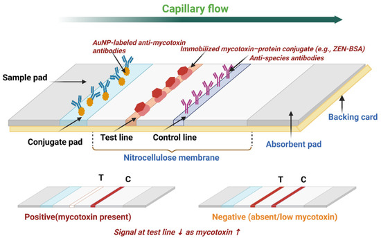 - Shahjahan, T.; Javed, B.; Sharma, V.; Tian, F. Overview of Various Components of Lateral-Flow Immunochromatography Assay for the Monitoring of Aflatoxin and Limit of Detection in Food Products: A Systematic Review. Chemosensors 2023, 11, 520. [Google Scholar] [CrossRef]