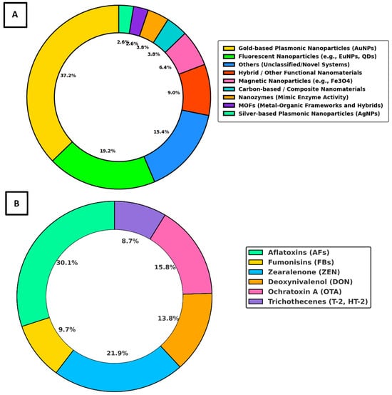| Cereals | DON, ZEN, T-2, TEA, AOH (Total: 15 mycotoxins) | AuNPs | Simultaneous detection of 15 mycotoxins in a single test | DON: 0.91, ZEN: 0.04, T-2: 0.11, TEA: 0.12, AOH: 0.09–0. | 2024 | [200] |